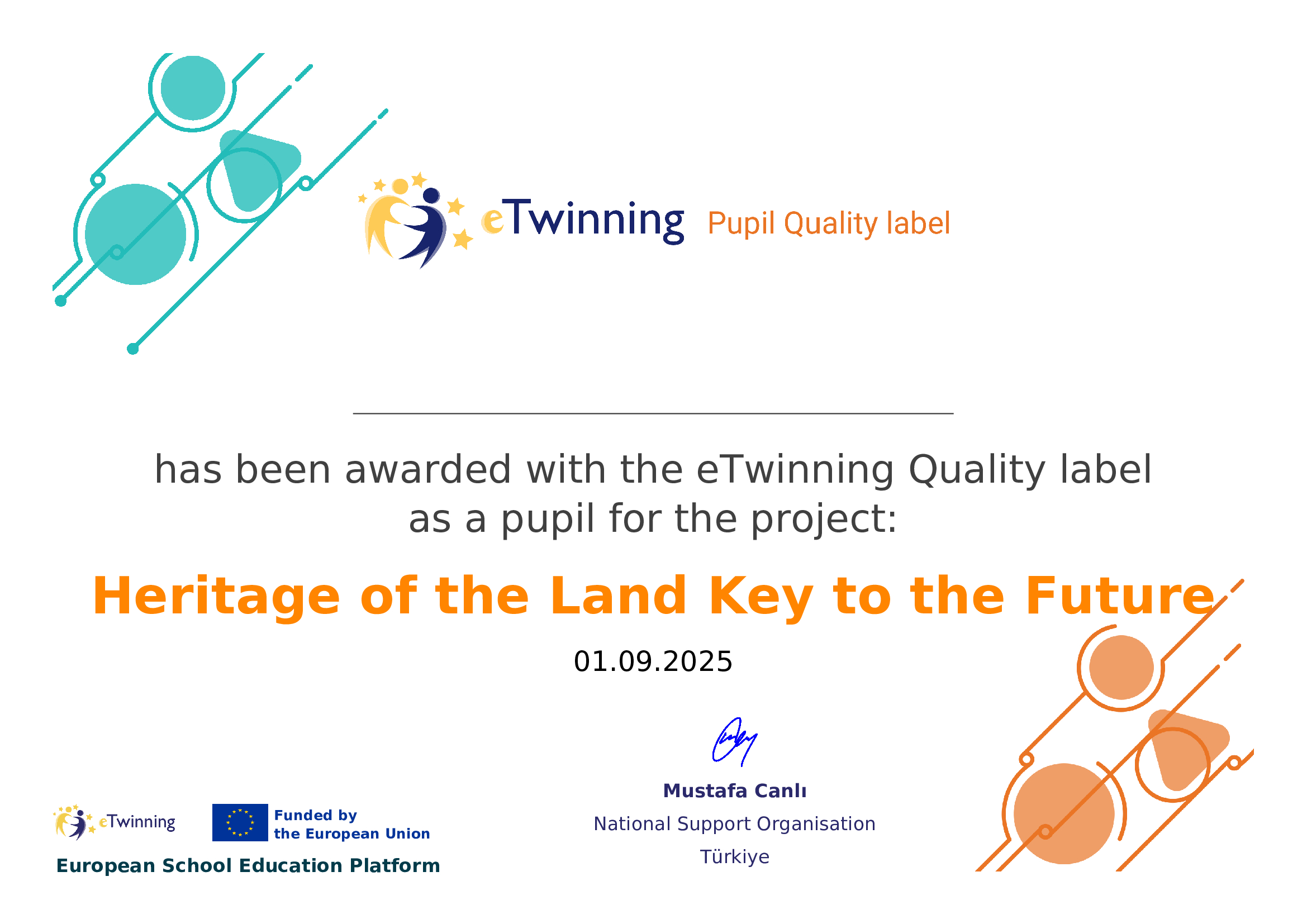 Son Projemiz olan "Toprağın Mirası Geleceğin Anahtarı" projemiz ile yine Ulusal Kalite etiketi ve Öğrenci Kalite etiketi alarak bir başarıya öğrencilerimizle imza attık